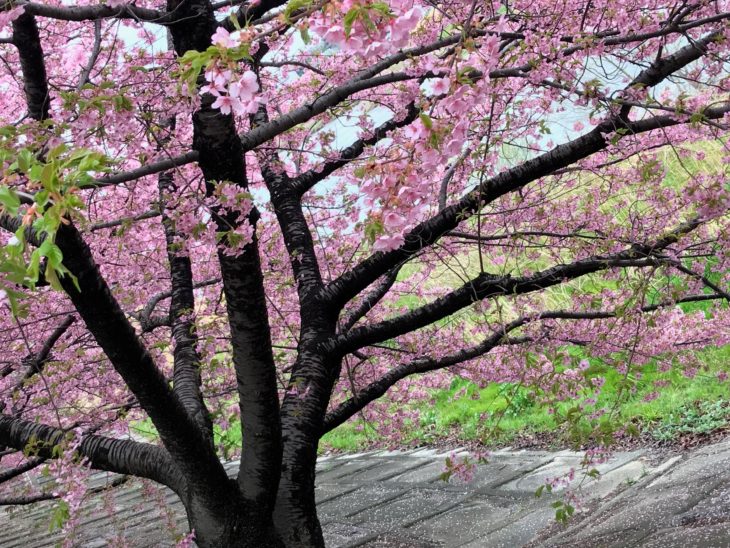 ソメイヨシノではないですが、スタッフが撮影してくれていた河津桜の並木も有名です。