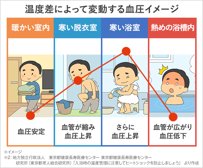 とくに高齢者は血圧変化を起こしやすく、体温の調節機能も低下しがちなことから、注意が必要です。
