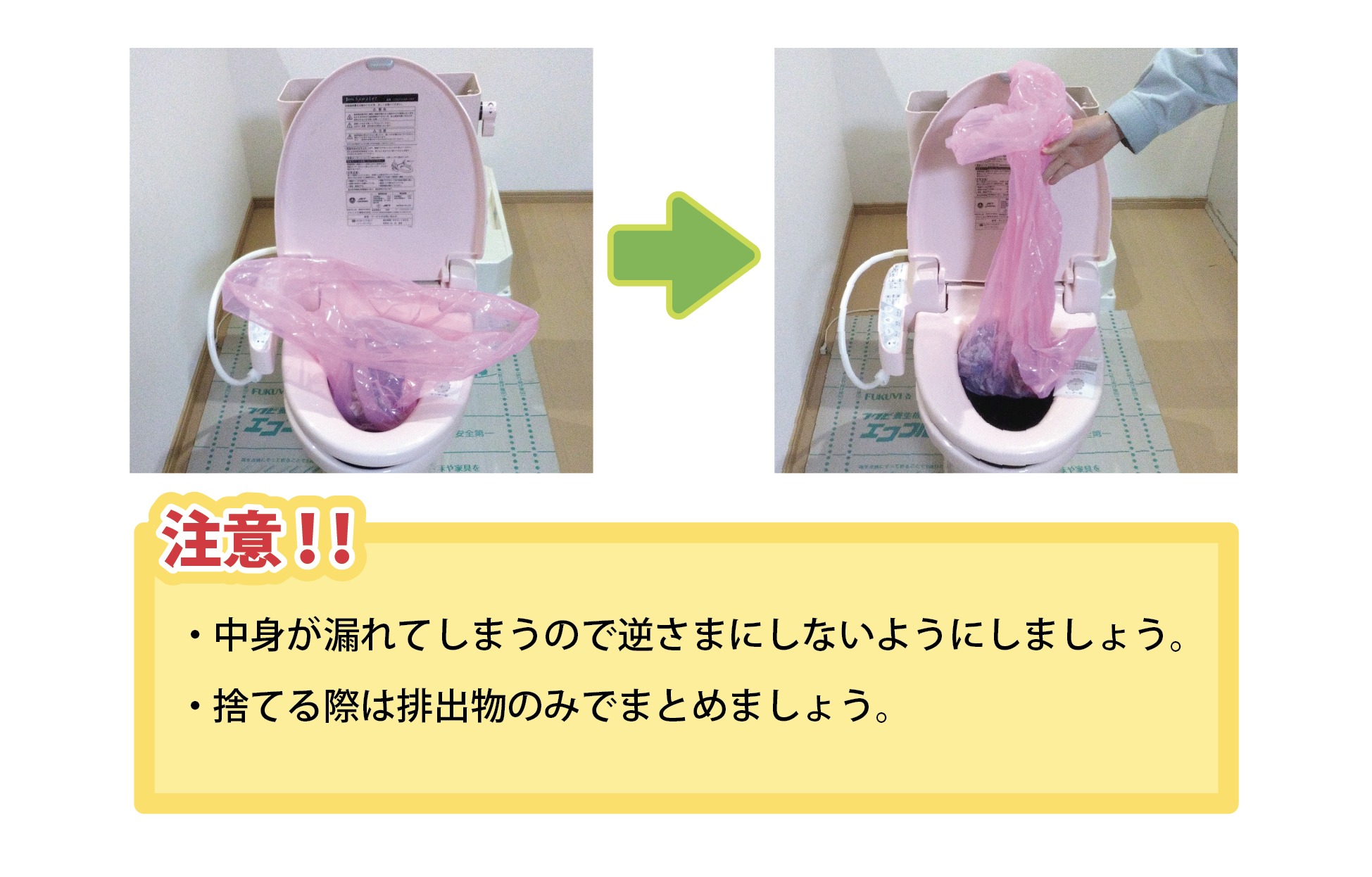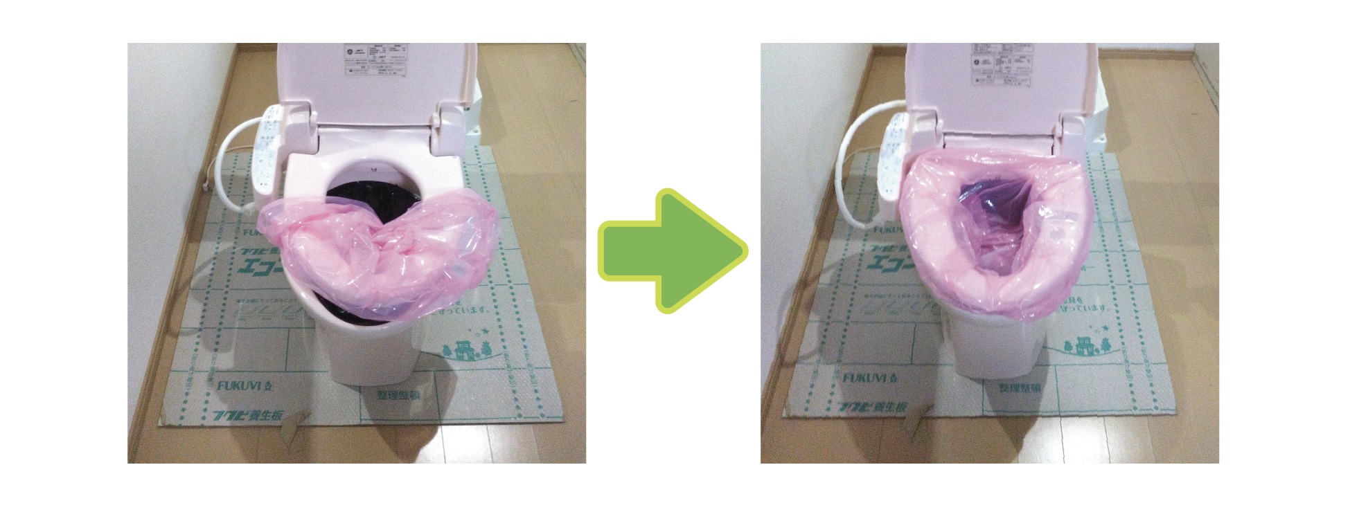 ①ビニール袋45ℓ(ピンク)を便座にかぶせる(前座を覆うようにして裏側に折り返します。)