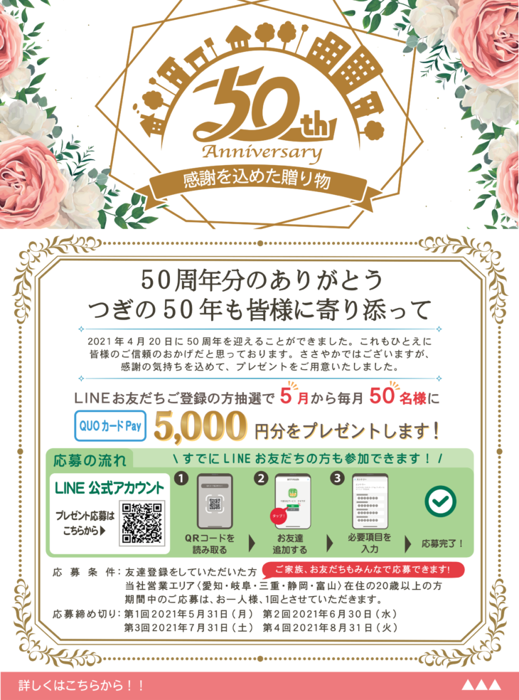 抽選で5月から毎月50名様にQUOカードPay5000円分をプレゼントいたします!
