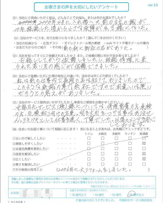 中部日化サービス(株)様については、修理・営業の方、点検の方、交換取り付けの方達、何も文句をつける事はありません。テキパキとして仕事も速く、丁寧でした。以後のメンテも安心しております。