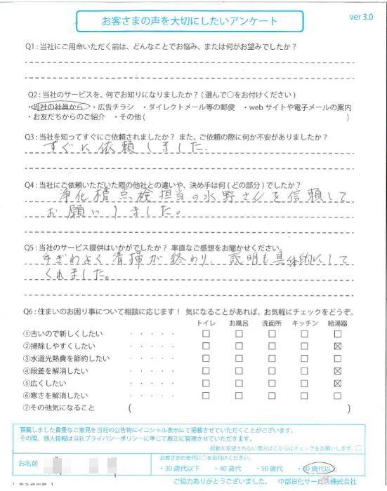 無料診断 HOMEお客様の声レンジフードを清掃された 鈴鹿市M様の声 レンジフードを清掃された 鈴鹿市M様の声 当社のサービスを、何でお知りになりましたか? 中部日化の社員から 当社を知ってすぐにご依頼されましたか?また、ご利用の際に何か不安がありましたか? すぐに依頼しました。 当社にご依頼いただいた際の他社との違いや、決め手は何(どの部分)でしたか? 浄化槽点検担当の水野さんを信頼してお願いしました。 当社のサービス提供はいかがでしたか?率直なご感想をお聞かせください。 手ぎわよく清掃が終わり、説明も具体的にしてくれました。 お客様の年代 60歳代以上 エリア 三重県 鈴鹿市 お客様の声一覧 住まうサポートについて 選ばれる理由 会社案内代表挨拶会社概要企業理念アクセスマップ 施工事例 施工事例一覧 収納 マンション 浴室 トイレ キッチン 洗面 和室 給湯器 住まいのメンテナンス お客様の声 お客様の声一覧 ブログ ブログ一覧 営業所紹介 安心・安全のおたより 住宅設備のイロハ スタッフのつぶやき お知らせ お役立ち情報 LINEでカンタン見積もり イベント・チラシ情報 リフォームの流れ よくある質問 「住まうサポート」会員規約 住宅省エネ2025キャンペーン 先進的窓リノベ2025事業 子育てグリーン住宅支援事業 給湯省エネ2025事業 お問い合わせ お問い合わせ 無料お見積もり ご相談・お問い合わせ 電話で相談 自宅にいながら相談できる お悩み事がすぐにすっきりする リフォームを最後までサポート WEBで相談 WEBから気軽に相談 複数の質問にも丁寧に回答 現地調査や見積依頼にも即対応 LINEで相談 使い慣れたLINEで気軽に相談 現場写真もラクラク送信 面倒なフォーム記載も無し 中部日化サービス株式会社 〒481-0038 愛知県北名古屋市徳重御宮前62 0120-24-4911 9:00~18:00 営業拠点のご案内 愛知県 北名古屋市・豊橋市・刈谷市・岡崎市 岐阜県 岐阜市・土岐市 富山県 富山市 三重県 津市・三重郡 静岡県 静岡市・沼津市・浜松市 トップページ 会社案内 選ばれる理由 会社案内代表挨拶会社概要企業理念アクセスマップ 施工事例一覧 施工事例一覧 収納 マンション 浴室 トイレ キッチン 洗面 和室 給湯器 住まいのメンテナンス お客様の声一覧 お役立ち情報 LINEでカンタン見積もりイベント・チラシ情報リフォームの流れよくある質問「住まうサポート」会員規約住宅省エネ2025キャンペーン先進的窓リノベ2025事業子育てグリーン住宅支援事業給湯省エネ2025事業 お問い合わせ お問い合わせ無料お見積もり © 2020 中部日化サービス株式会社