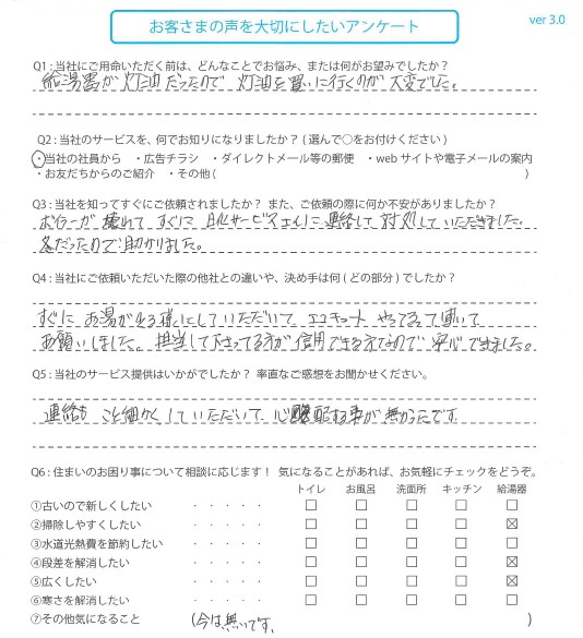 すぐにお湯がでるようにしていただいて、エコキュートやってるって聞いて、お願いしました。担当してくださっている方が信用できる方なので安心できました。