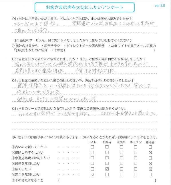 前にも来ていただいた、その時の対応がとても丁寧でわかりやすかったので、名刺を見てすぐ連絡しました。 不安はありませんでした。