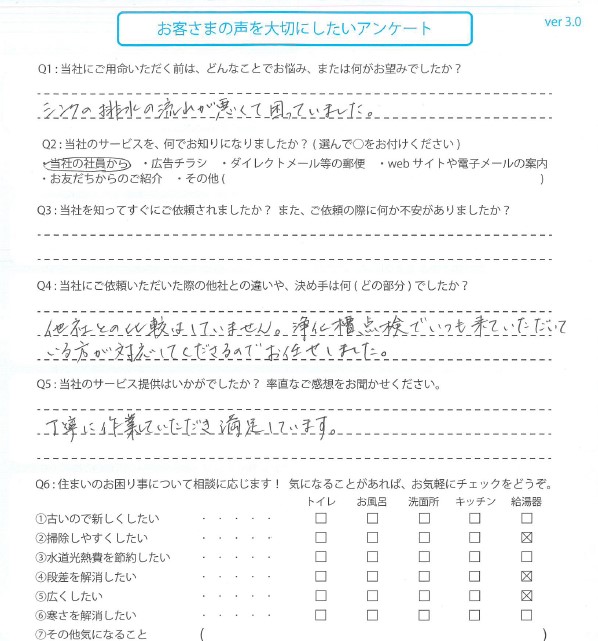 シンクの排水の流れが悪くて、困っていました。