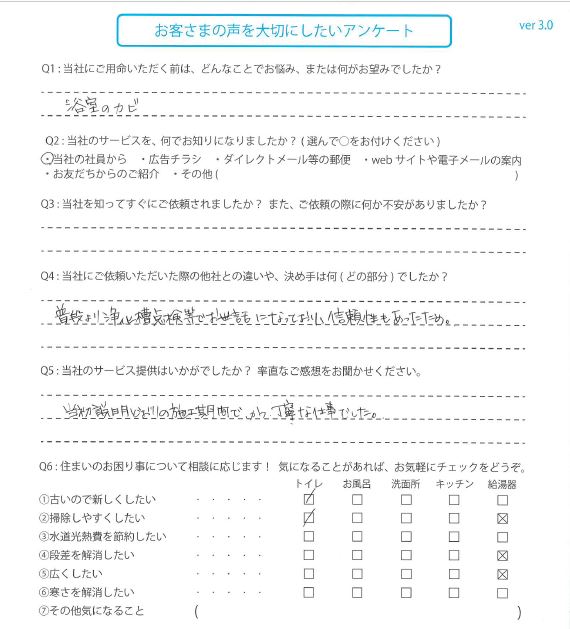 無料診断 HOMEお客様の声ユニットバスを交換された 岐阜県のY様の声 ユニットバスを交換された 岐阜県のY様の声 当社にご用命いただく前は、どんなことでお悩み、または何がお望みでしたか? 浴室のカビ 当社のサービスを、何でお知りになりましたか? 当社の社員から 当社にご依頼いただいた際の他社との違いや、決め手は何(どの部分)でしたか? 普段より浄化槽点検等でお世話になっており、信頼性もあったため。 当社のサービス提供はいかがでしたか?率直なご感想をお聞かせください。 当初説明どおりの施工期間で、かつ丁寧な仕事でした。 営業所 岐阜 お客様の声一覧 住まうサポートについて 選ばれる理由 会社案内代表挨拶会社概要企業理念アクセスマップ 施工事例 施工事例一覧 収納 マンション 浴室 トイレ キッチン 洗面 和室 給湯器 住まいのメンテナンス お客様の声 お客様の声一覧 ブログ ブログ一覧 営業所紹介 安心・安全のおたより 住宅設備のイロハ スタッフのつぶやき お知らせ お役立ち情報 LINEでカンタン見積もり イベント・チラシ情報 リフォームの流れ よくある質問 「住まうサポート」会員規約 住宅省エネ2025キャンペーン 先進的窓リノベ2025事業 子育てグリーン住宅支援事業 給湯省エネ2025事業 お問い合わせ お問い合わせ 無料お見積もり ご相談・お問い合わせ 電話で相談 自宅にいながら相談できる お悩み事がすぐにすっきりする リフォームを最後までサポート WEBで相談 WEBから気軽に相談 複数の質問にも丁寧に回答 現地調査や見積依頼にも即対応 LINEで相談 使い慣れたLINEで気軽に相談 現場写真もラクラク送信 面倒なフォーム記載も無し 中部日化サービス株式会社 〒481-0038 愛知県北名古屋市徳重御宮前62 0120-24-4911 9:00~18:00 営業拠点のご案内 愛知県 北名古屋市・豊橋市・刈谷市・岡崎市 岐阜県 岐阜市・土岐市 富山県 富山市 三重県 津市・三重郡 静岡県 静岡市・沼津市・浜松市 トップページ 会社案内 選ばれる理由 会社案内代表挨拶会社概要企業理念アクセスマップ 施工事例一覧 施工事例一覧 収納 マンション 浴室 トイレ キッチン 洗面 和室 給湯器 住まいのメンテナンス お客様の声一覧 お役立ち情報 LINEでカンタン見積もりイベント・チラシ情報リフォームの流れよくある質問「住まうサポート」会員規約住宅省エネ2025キャンペーン先進的窓リノベ2025事業子育てグリーン住宅支援事業給湯省エネ2025事業 お問い合わせ お問い合わせ無料お見積もり © 2020 中部日化サービス株式会社