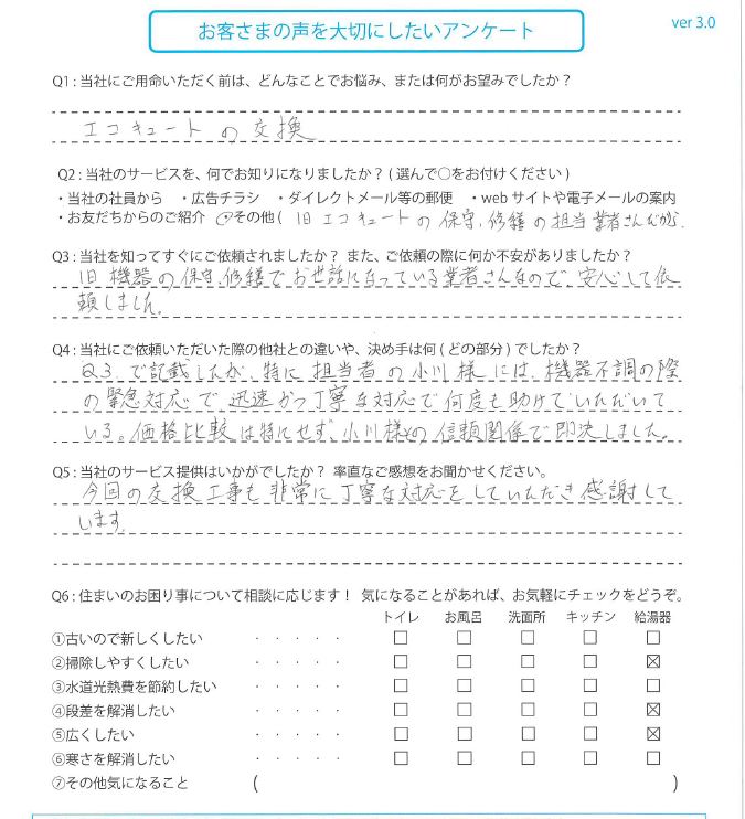 今回の交換工事も非常に丁寧な対応をしていただき感謝しています。