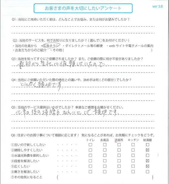 無料診断 HOMEお客様の声排水管洗浄された 三重県のM様の声 排水管洗浄された 三重県のM様の声 当社のサービスを、何でお知りになりましたか? 広告チラシ 当社を知ってすぐにご依頼されましたか?また、ご利用の際に何か不安がありましたか? 最初から当社に依頼していたので 当社にご依頼いただいた際の他社との違いや、決め手は何(どの部分)でしたか? とにかく親切です 当社のサービス提供はいかがでしたか?率直なご感想をお聞かせください。 作業の後の掃除もきれいにして親切です お客様の年代 60歳代以上 営業所 北勢 お客様の声一覧 住まうサポートについて 選ばれる理由 会社案内代表挨拶会社概要企業理念アクセスマップ 施工事例 施工事例一覧 収納 マンション 浴室 トイレ キッチン 洗面 和室 給湯器 住まいのメンテナンス お客様の声 お客様の声一覧 ブログ ブログ一覧 営業所紹介 安心・安全のおたより 住宅設備のイロハ スタッフのつぶやき お知らせ お役立ち情報 LINEでカンタン見積もり イベント・チラシ情報 リフォームの流れ よくある質問 「住まうサポート」会員規約 住宅省エネ2025キャンペーン 先進的窓リノベ2025事業 子育てグリーン住宅支援事業 給湯省エネ2025事業 お問い合わせ お問い合わせ 無料お見積もり ご相談・お問い合わせ 電話で相談 自宅にいながら相談できる お悩み事がすぐにすっきりする リフォームを最後までサポート WEBで相談 WEBから気軽に相談 複数の質問にも丁寧に回答 現地調査や見積依頼にも即対応 LINEで相談 使い慣れたLINEで気軽に相談 現場写真もラクラク送信 面倒なフォーム記載も無し 中部日化サービス株式会社 〒481-0038 愛知県北名古屋市徳重御宮前62 0120-24-4911 9:00~18:00 営業拠点のご案内 愛知県 北名古屋市・豊橋市・刈谷市・岡崎市 岐阜県 岐阜市・土岐市 富山県 富山市 三重県 津市・三重郡 静岡県 静岡市・沼津市・浜松市 トップページ 会社案内 選ばれる理由 会社案内代表挨拶会社概要企業理念アクセスマップ 施工事例一覧 施工事例一覧 収納 マンション 浴室 トイレ キッチン 洗面 和室 給湯器 住まいのメンテナンス お客様の声一覧 お役立ち情報 LINEでカンタン見積もりイベント・チラシ情報リフォームの流れよくある質問「住まうサポート」会員規約住宅省エネ2025キャンペーン先進的窓リノベ2025事業子育てグリーン住宅支援事業給湯省エネ2025事業 お問い合わせ お問い合わせ無料お見積もり © 2020 中部日化サービス株式会社