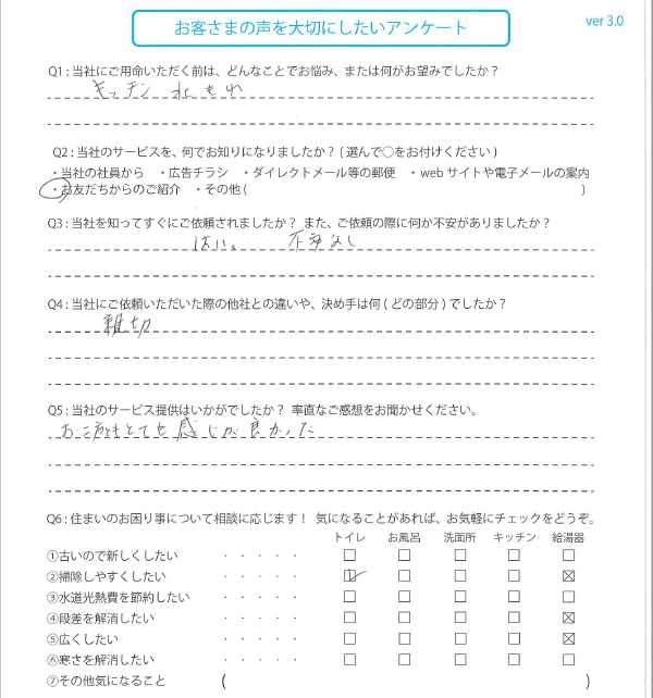 無料診断 HOMEお客様の声キッチン水栓を交換された 岐阜県のK様の声 キッチン水栓を交換された 岐阜県のK様の声 当社にご用命いただく前は、どんなことでお悩み、または何がお望みでしたか? キッチン 水もれ 当社のサービスを、何でお知りになりましたか? お友だちからのご紹介 当社を知ってすぐにご依頼されましたか?また、ご利用の際に何か不安がありましたか? はい、不安なし 当社にご依頼いただいた際の他社との違いや、決め手は何(どの部分)でしたか? 親切 当社のサービス提供はいかがでしたか?率直なご感想をお聞かせください。 お二方とも感じが良かった 営業所 岐阜 お客様の声一覧 住まうサポートについて 選ばれる理由 会社案内代表挨拶会社概要企業理念アクセスマップ 施工事例 施工事例一覧 収納 マンション 浴室 トイレ キッチン 洗面 和室 給湯器 住まいのメンテナンス お客様の声 お客様の声一覧 ブログ ブログ一覧 営業所紹介 安心・安全のおたより 住宅設備のイロハ スタッフのつぶやき お知らせ お役立ち情報 LINEでカンタン見積もり イベント・チラシ情報 リフォームの流れ よくある質問 「住まうサポート」会員規約 住宅省エネ2025キャンペーン 先進的窓リノベ2025事業 子育てグリーン住宅支援事業 給湯省エネ2025事業 お問い合わせ お問い合わせ 無料お見積もり ご相談・お問い合わせ 電話で相談 自宅にいながら相談できる お悩み事がすぐにすっきりする リフォームを最後までサポート WEBで相談 WEBから気軽に相談 複数の質問にも丁寧に回答 現地調査や見積依頼にも即対応 LINEで相談 使い慣れたLINEで気軽に相談 現場写真もラクラク送信 面倒なフォーム記載も無し 中部日化サービス株式会社 〒481-0038 愛知県北名古屋市徳重御宮前62 0120-24-4911 9:00~18:00 営業拠点のご案内 愛知県 北名古屋市・豊橋市・刈谷市・岡崎市 岐阜県 岐阜市・土岐市 富山県 富山市 三重県 津市・三重郡 静岡県 静岡市・沼津市・浜松市 トップページ 会社案内 選ばれる理由 会社案内代表挨拶会社概要企業理念アクセスマップ 施工事例一覧 施工事例一覧 収納 マンション 浴室 トイレ キッチン 洗面 和室 給湯器 住まいのメンテナンス お客様の声一覧 お役立ち情報 LINEでカンタン見積もりイベント・チラシ情報リフォームの流れよくある質問「住まうサポート」会員規約住宅省エネ2025キャンペーン先進的窓リノベ2025事業子育てグリーン住宅支援事業給湯省エネ2025事業 お問い合わせ お問い合わせ無料お見積もり © 2020 中部日化サービス株式会社