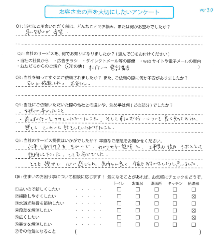・前のボイラーをつけていただいたこと。そして前のボイラーについて良く知っておられ、詳しくていねいに話をしていただけたこと。