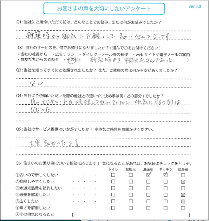 無料診断 HOMEお客様の声エコキュートを交換された 岐阜県のI様の声 エコキュートを交換された 岐阜県のI様の声 当社にご用命いただく前は、どんなことでお悩み、または何がお望みでしたか? 新築時から御社にお願いしているのに他にはないです 当社のサービスを、何でお知りになりましたか? 新築時より、中部日化さんであった 当社にご依頼いただいた際の他社との違いや、決め手は何(どの部分)でしたか? 前のエコキュートも修理してもらっていたし 他社にするつもりはなかった 当社のサービス提供はいかがでしたか?率直なご感想をお聞かせください。 大変良かったです お客様の年代 50歳代 営業所 岐阜営業所 お客様の声一覧 住まうサポートについて 選ばれる理由 会社案内代表挨拶会社概要企業理念アクセスマップ 施工事例 施工事例一覧 収納 マンション 浴室 トイレ キッチン 洗面 和室 給湯器 住まいのメンテナンス お客様の声 お客様の声一覧 ブログ ブログ一覧 営業所紹介 安心・安全のおたより 住宅設備のイロハ スタッフのつぶやき お知らせ お役立ち情報 LINEでカンタン見積もり イベント・チラシ情報 リフォームの流れ よくある質問 「住まうサポート」会員規約 住宅省エネ2025キャンペーン 先進的窓リノベ2025事業 子育てグリーン住宅支援事業 給湯省エネ2025事業 お問い合わせ お問い合わせ 無料お見積もり ご相談・お問い合わせ 電話で相談 自宅にいながら相談できる お悩み事がすぐにすっきりする リフォームを最後までサポート WEBで相談 WEBから気軽に相談 複数の質問にも丁寧に回答 現地調査や見積依頼にも即対応 LINEで相談 使い慣れたLINEで気軽に相談 現場写真もラクラク送信 面倒なフォーム記載も無し 中部日化サービス株式会社 〒481-0038 愛知県北名古屋市徳重御宮前62 0120-24-4911 9:00~18:00 営業拠点のご案内 愛知県 北名古屋市・豊橋市・刈谷市・岡崎市 岐阜県 岐阜市・土岐市 富山県 富山市 三重県 津市・三重郡 静岡県 静岡市・沼津市・浜松市 トップページ 会社案内 選ばれる理由 会社案内代表挨拶会社概要企業理念アクセスマップ 施工事例一覧 施工事例一覧 収納 マンション 浴室 トイレ キッチン 洗面 和室 給湯器 住まいのメンテナンス お客様の声一覧 お役立ち情報 LINEでカンタン見積もりイベント・チラシ情報リフォームの流れよくある質問「住まうサポート」会員規約住宅省エネ2025キャンペーン先進的窓リノベ2025事業子育てグリーン住宅支援事業給湯省エネ2025事業 お問い合わせ お問い合わせ無料お見積もり © 2020 中部日化サービス株式会社