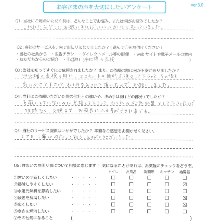 お願いしていないのに点検して下さって、水もれの応急処置をして下さったので故障なく、交換までお風呂に入る事ができた事です。