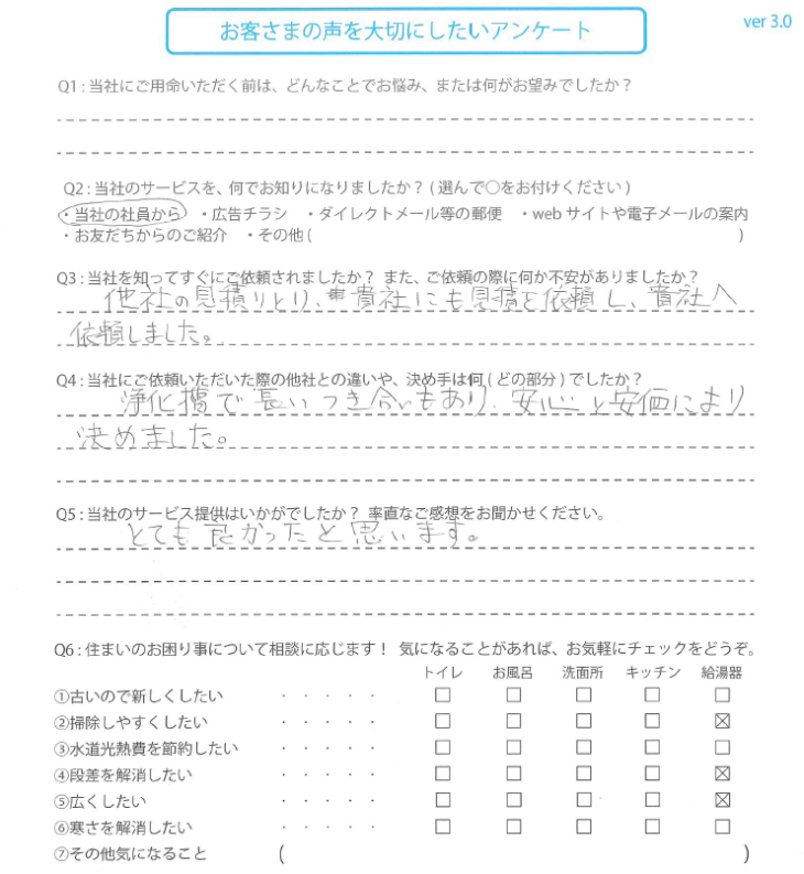 無料診断 HOMEお客様の声ガス給湯器を交換された 三重県のM様の声 ガス給湯器を交換された 三重県のM様の声 当社のサービスを、何でお知りになりましたか? 当社の社員から 当社を知ってすぐにご依頼されましたか?また、ご利用の際に何か不安がありましたか? 他社の見積をとり、貴社にも見積を依頼し、貴社へ依頼しました。 当社にご依頼いただいた際の他社との違いや、決め手は何(どの部分)でしたか? 浄化槽で長い付き合いもあり、安心と安価により決めました。 当社のサービス提供はいかがでしたか?率直なご感想をお聞かせください。 とても良かったと思います。 お客様の年代 60歳代 営業所 北勢営業所 お客様の声一覧 住まうサポートについて 選ばれる理由 会社案内代表挨拶会社概要企業理念アクセスマップ 施工事例 施工事例一覧 収納 マンション 浴室 トイレ キッチン 洗面 和室 給湯器 住まいのメンテナンス お客様の声 お客様の声一覧 ブログ ブログ一覧 営業所紹介 安心・安全のおたより 住宅設備のイロハ スタッフのつぶやき お知らせ お役立ち情報 LINEでカンタン見積もり イベント・チラシ情報 リフォームの流れ よくある質問 「住まうサポート」会員規約 住宅省エネ2025キャンペーン 先進的窓リノベ2025事業 子育てグリーン住宅支援事業 給湯省エネ2025事業 お問い合わせ お問い合わせ 無料お見積もり ご相談・お問い合わせ 電話で相談 自宅にいながら相談できる お悩み事がすぐにすっきりする リフォームを最後までサポート WEBで相談 WEBから気軽に相談 複数の質問にも丁寧に回答 現地調査や見積依頼にも即対応 LINEで相談 使い慣れたLINEで気軽に相談 現場写真もラクラク送信 面倒なフォーム記載も無し 中部日化サービス株式会社 〒481-0038 愛知県北名古屋市徳重御宮前62 0120-24-4911 9:00~18:00 営業拠点のご案内 愛知県 北名古屋市・豊橋市・刈谷市・岡崎市 岐阜県 岐阜市・土岐市 富山県 富山市 三重県 津市・三重郡 静岡県 静岡市・沼津市・浜松市 トップページ 会社案内 選ばれる理由 会社案内代表挨拶会社概要企業理念アクセスマップ 施工事例一覧 施工事例一覧 収納 マンション 浴室 トイレ キッチン 洗面 和室 給湯器 住まいのメンテナンス お客様の声一覧 お役立ち情報 LINEでカンタン見積もりイベント・チラシ情報リフォームの流れよくある質問「住まうサポート」会員規約住宅省エネ2025キャンペーン先進的窓リノベ2025事業子育てグリーン住宅支援事業給湯省エネ2025事業 お問い合わせ お問い合わせ無料お見積もり © 2020 中部日化サービス株式会社