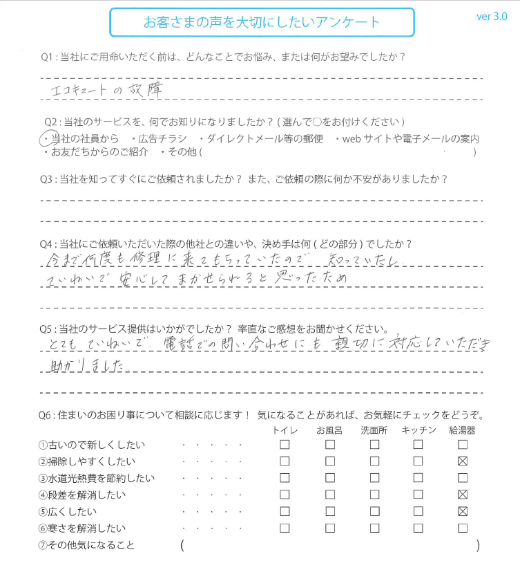 今まで何度も修理に来てもらっていたので知っていたし、ていねいで安心してまかせられると思ったため。