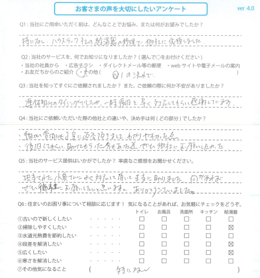 特になし。ハウステック社の給湯器の修理で御社に依頼しました。