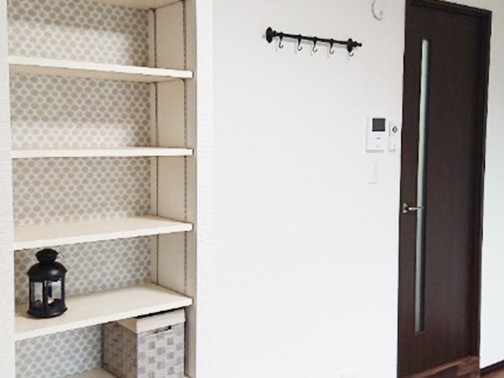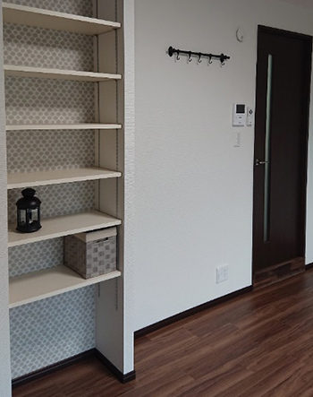 可能式棚板のオープンラックを設置し、小物の収納はもちろん背面にアクセントクロスを張ることで玄関周りの印象を良くします。